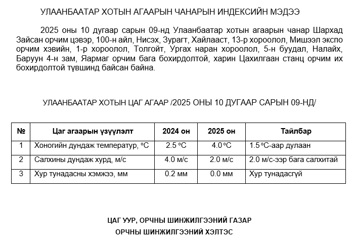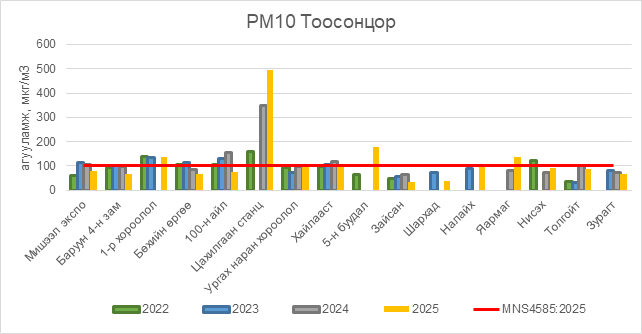2025 оны 10 дугаар сарын 09-ний байдлаар РМ10 тоосонцор нь 1-р хороолол орчим АЧС-аас 35 мкг/м3 –ээр их, Цахилгаан станц орчим АЧС-аас 393 мкг/м3 –ээр их, Ургах наран хороолол орчим АЧС-аас 2 мкг/м3 –ээр их, 5-н буудал орчим АЧС-аас 78 мкг/м3 –ээр их, Налайх орчим АЧС-аас 5 мкг/м3 –ээр их, Яармаг орчим АЧС-аас 35 мкг/м3 –ээр их, бусад цэгүүдэд MNS 4585:2025 АЧС-аас даваагүй байна.