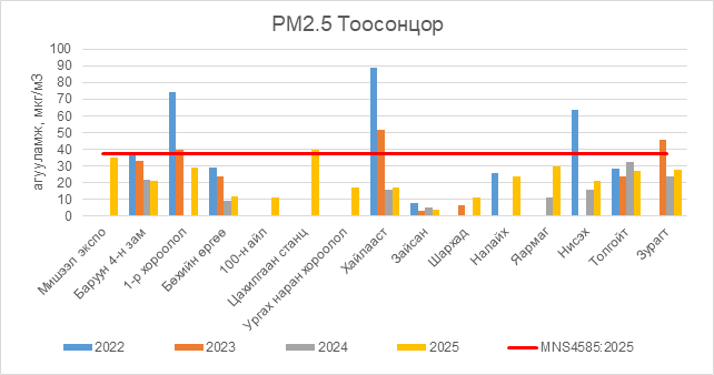 2025 оны 10 дугаар сарын 09-ний байдлаар РМ2.5 тоосонцор нь Цахилгаан станц орчим АЧС-аас 2.5 мкг/м3 –ээр их, бусад цэгүүдэд MNS 4585:2025 АЧС-аас даваагүй байна.