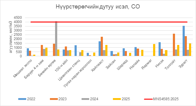 2025 оны 10 дугаар сарын 09-ний байдлаар нүүрстөрөгчийн дутуу исэл (СО) нь бүх цэгүүдэд MNS 4585:2025 АЧС-аас даваагүй байна.