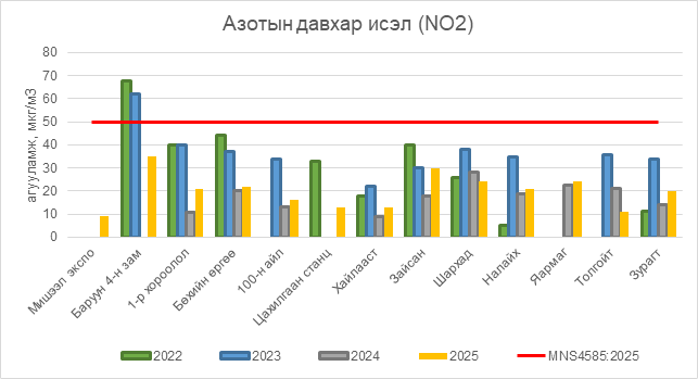 2025 оны 10 дугаар сарын 14-ний байдлаар азотын давхар исэл (NO2) нь бүх цэгүүдэд MNS 4585:2025 АЧС-аас даваагүй байна.