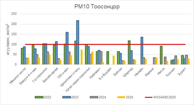 2025 оны 10 дугаар сарын 14-ний байдлаар РМ10 тоосонцор нь бүх цэгүүдэд MNS 4585:2025 АЧС-аас даваагүй байна.