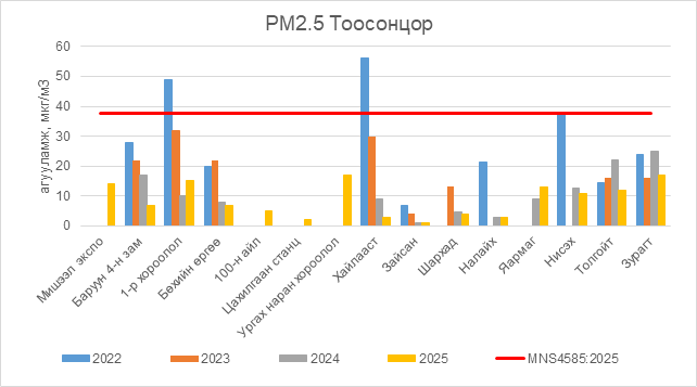 2025 оны 10 дугаар сарын 14-ний байдлаар РМ2.5 тоосонцор нь бүх цэгүүдэд MNS 4585:2025 АЧС-аас даваагүй байна.