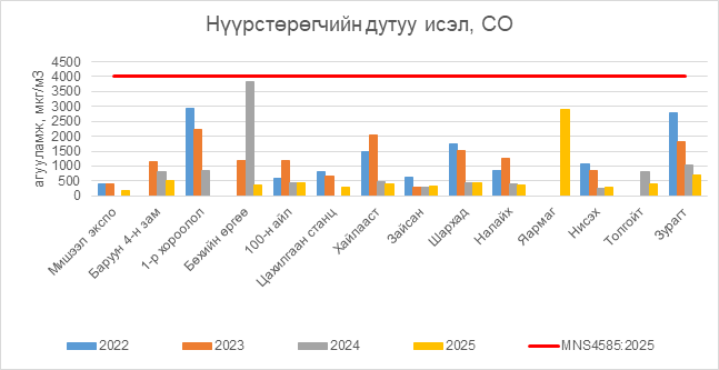 2025 оны 10 дугаар сарын 14-ний байдлаар нүүрстөрөгчийн дутуу исэл (СО) нь бүх цэгүүдэд MNS 4585:2025 АЧС-аас даваагүй байна.