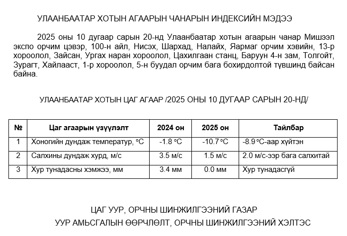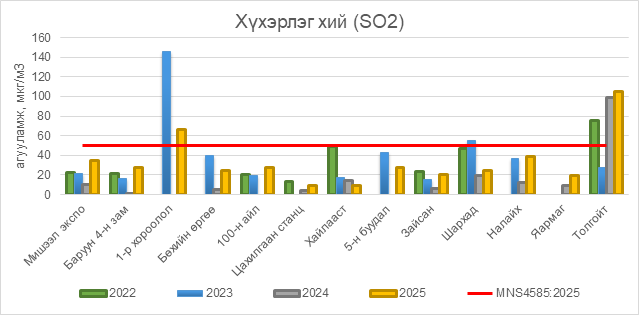 2025 оны 10 дугаар сарын 20-ны байдлаар хүхэрлэг хий (SO2) нь 1-р хороолол орчим 16 мкг/м3 –ээр их, Толгойт орчим АЧС-аас 55 мкг/м3 –ээр их, бусад цэгүүдэд MNS 4585:2025 АЧС-аас даваагүй байна.