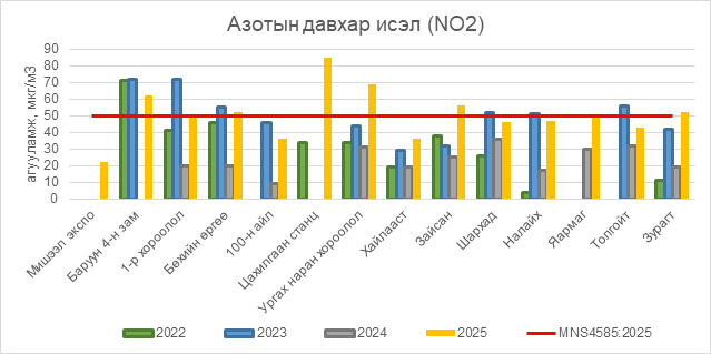 Азотын давхар исэл (NO2) нь Баруун 4-н зам орчим АЧС-аас 12 мкг/м3 –ээр их, Бөхийн өргөө орчим АЧС-аас 2 мкг/м3 –ээр их, Цахилгаан станц орчим АЧС-аас 35 мкг/м3 –ээр их, Ургах наран хороолол орчим АЧС-аас 19 мкг/м3 –ээр их, Зайсан орчим АЧС-аас 6 мкг/м3 –ээр их, Зурагт орчим АЧС-аас 2 мкг/м3 –ээр их, бусад цэгүүдэд MNS 4585:2025 АЧС-аас даваагүй байна.
