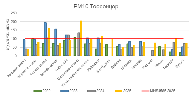 РМ10 тоосонцор нь 1-р хороолол орчим АЧС-аас 62 мкг/м3 –ээр их, Цахилгаан станц орчим АЧС-аас 107 мкг/м3 –ээр их, Хайлааст орчим АЧС-аас 17 мкг/м3 –ээр их, 5-н буудал орчим АЧС-аас 2 мкг/м3 –ээр их, Толгойт орчим АЧС-аас 4 мкг/м3 –ээр их, бусад цэгүүдэд MNS 4585:2025 АЧС-аас даваагүй байна.