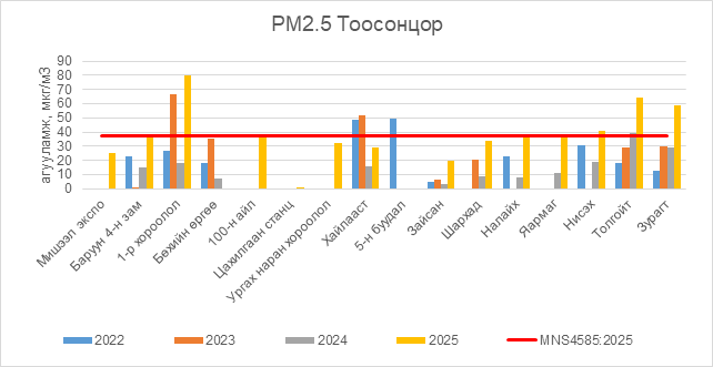 РМ2.5 тоосонцор нь 1-р хороолол орчим АЧС-аас 42.5 мкг/м3 –ээр их, Налайх орчим АЧС-аас 0.5 мкг/м3 –ээр их, Нисэх орчим АЧС-аас 3.5 мкг/м3 –ээр их, Толгойт орчим АЧС-аас 26.5 мкг/м3 –ээр их, Зурагт орчим АЧС-аас 21.5 мкг/м3 –ээр их, бусад цэгүүдэд MNS 4585:2025 АЧС-аас даваагүй байна.