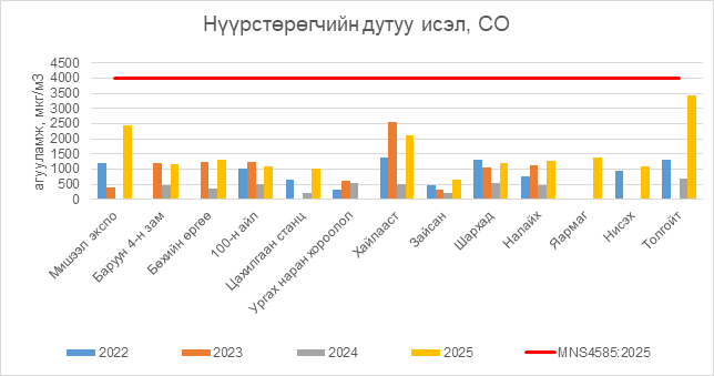 Нүүрстөрөгчийн дутуу исэл (СО) нь бүх цэгүүдэд MNS 4585:2025 АЧС-аас даваагүй байна.