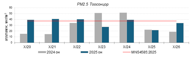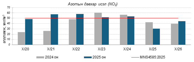 Улаанбаатар хотын агаарт түгээмэл бохирдуулах бодис хүхэрлэг хий /SO2/, азотын давхар исэл /NO2/, тоосонцор /PM10, PM2.5/, нүүрстөрөгчийн дутуу исэл /CO/, озон /O3/-ны агууламжийг тодорхойллоо.