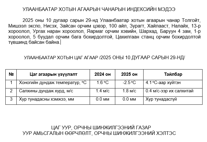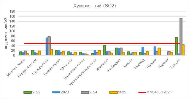 2025 оны 10 дугаар сарын 29-ний байдлаар хүхэрлэг хий (SO2) нь бүх цэгүүдэд MNS 4585:2025 АЧС-аас даваагүй байна.