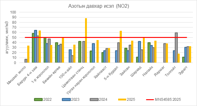 Азотын давхар исэл (NO2) нь Баруун 4 зам орчим АЧС-аас 14 мкг/м3 –ээр их, Цахилгаан станц орчим АЧС-аас 38 мкг/м3 –ээр их, 5 буудал орчим АЧС-аас 13 мкг/м3 –ээр их, Шархад орчим АЧС-аас 1 мкг/м3 –ээр их, бусад цэгүүдэд MNS 4585:2025 АЧС-аас даваагүй байна.