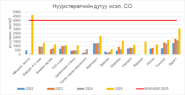 Нүүрстөрөгчийн дутуу исэл (СО) нь Мишээл экспо орчим АЧС-аас 662 мкг/м3 –ээр их, бусад цэгүүдэд MNS 4585:2025 АЧС-аас даваагүй байна.