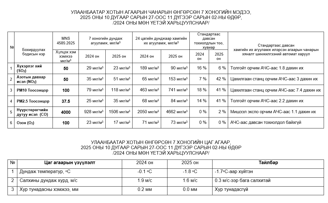 Улаанбаатар хотын агаарт түгээмэл бохирдуулах бодис хүхэрлэг хий /SO2/, азотын давхар исэл /NO2/, тоосонцор /PM10, PM2.5/, нүүрстөрөгчийн дутуу исэл /CO/, озон /O3/-ны агууламжийг тодорхойллоо.