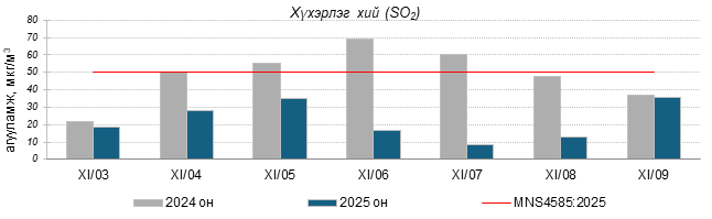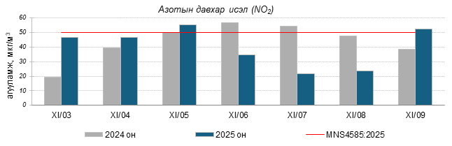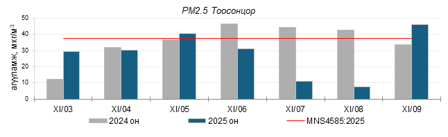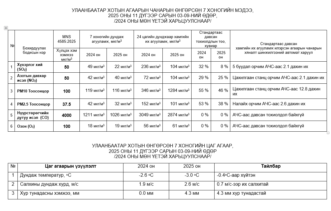 Улаанбаатар хотын агаарт түгээмэл бохирдуулах бодис хүхэрлэг хий /SO2/, азотын давхар исэл /NO2/, тоосонцор /PM10, PM2.5/, нүүрстөрөгчийн дутуу исэл /CO/, озон /O3/-ны агууламжийг тодорхойллоо.