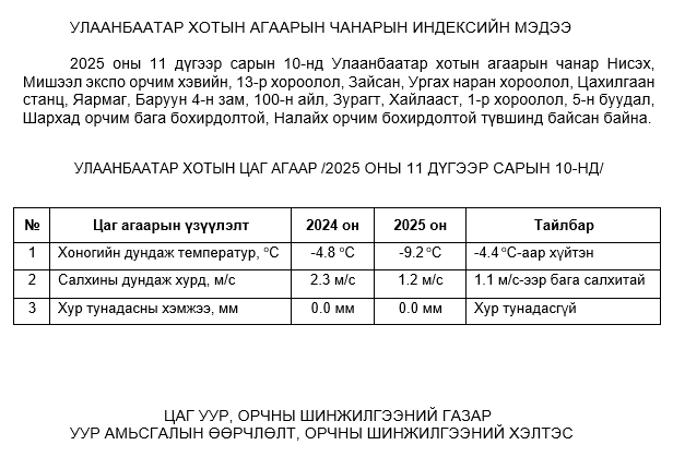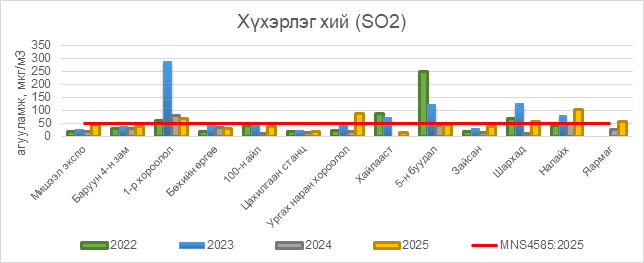 2025 оны 11 дүгээр сарын 10-ны байдлаар хүхэрлэг хий (SO2) нь 1-р хороолол орчим 18 мкг/м3 –ээр их, Ургах наран хороолол орчим АЧС-аас 36 мкг/м3 –ээр их, Шархад орчим АЧС-аас 8 мкг/м3 –ээр их, Налайх орчим АЧС-аас 54 мкг/м3 –ээр их, Яармаг орчим АЧС-аас 7 мкг/м3 –ээр их, бусад цэгүүдэд MNS 4585:2025 АЧС-аас даваагүй байна.