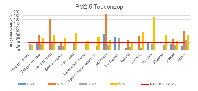 РМ2.5 тоосонцор нь Баруун 4-н зам орчим АЧС-аас 26.5 мкг/м3 –ээр их, 1-р хороолол орчим АЧС-аас 43.5 мкг/м3 –ээр их, Бөхийн өргөө орчим АЧС-аас 26.5 мкг/м3 –ээр их, 100-н айл орчим АЧС-аас 49.5 мкг/м3 –ээр их, Цахилгаан станц орчим АЧС-аас 8.5 мкг/м3 –ээр их, Ургах наран хороолол орчим АЧС-аас 30.5 мкг/м3 –ээр их, Хайлааст орчим АЧС-аас 12.5 мкг/м3 –ээр их, Шархад орчим АЧС-аас 56.5 мкг/м3 –ээр их, Налайх орчим АЧС-аас 136.5 мкг/м3 –ээр их, Яармаг орчим АЧС-аас 40.5 мкг/м3 –ээр их, Нисэх орчим АЧС-аас 11.5 мкг/м3 –ээр их, Зурагт орчим АЧС-аас 43.5 мкг/м3 –ээр их байна.