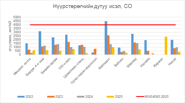 Нүүрстөрөгчийн дутуу исэл (СО) нь бүх цэгүүдэд MNS 4585:2025 АЧС-аас даваагүй байна.