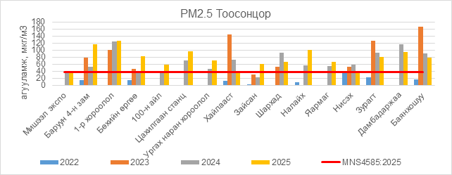 РМ2.5 тоосонцор нь Мишээл экспо орчим АЧС-аас 3.5 мкг/м3 –ээр их, Баруун 4-н зам орчим АЧС-аас 79.5 мкг/м3 –ээр их, 1-р хороолол орчим АЧС-аас 88.5 мкг/м3 –ээр их, Бөхийн өргөө орчим АЧС-аас 45.5 мкг/м3 –ээр их, 100-н айл орчим АЧС-аас 21.5 мкг/м3 –ээр их, Цахилгаан станц орчим АЧС-аас 58.5 мкг/м3 –ээр их, Ургах наран хороолол орчим АЧС-аас 33.5 мкг/м3 –ээр их, Хайлааст орчим АЧС-аас 3.5 мкг/м3 –ээр их, Зайсан орчим АЧС-аас 22.5 мкг/м3 –ээр их, Шархад орчим АЧС-аас 29.5 мкг/м3 –ээр их, Налайх орчим АЧС-аас 62.5 мкг/м3 –ээр их, Яармаг орчим АЧС-аас 28.5 мкг/м3 –ээр их, Нисэх орчим АЧС-аас 3.5 мкг/м3 –ээр их, Зурагт орчим АЧС-аас 42.5 мкг/м3 –ээр их, Дамбадаржаа орчим АЧС-аас 56.5 мкг/м3 –ээр их, Баянхошуу орчим АЧС-аас 40.5 мкг/м3 –ээр их байна.