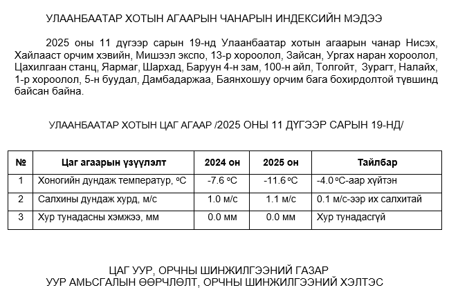 2025 оны 11 дүгээр сарын 19-ний байдлаар хүхэрлэг хий (SO2) нь Ургах наран хороолол орчим АЧС-аас 10 мкг/м3 –ээр их, Шархад орчим АЧС-аас 50 мкг/м3 –ээр их, Налайх орчим АЧС-аас 38 мкг/м3 –ээр их, бусад цэгүүдэд MNS 4585:2025 АЧС-аас даваагүй байна.