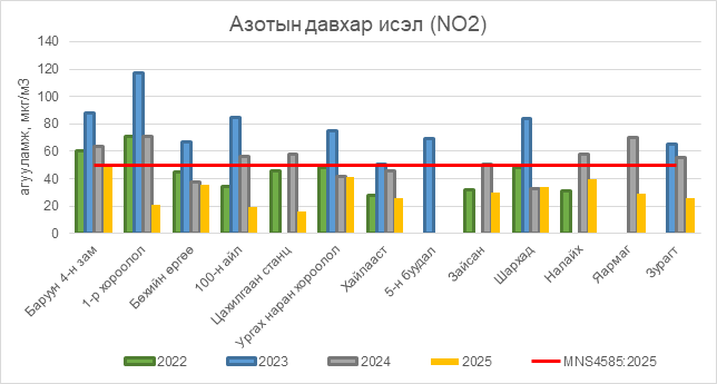 Азотын давхар исэл (NO2) нь бүх цэгүүдэд MNS 4585:2025 АЧС-аас даваагүй байна.