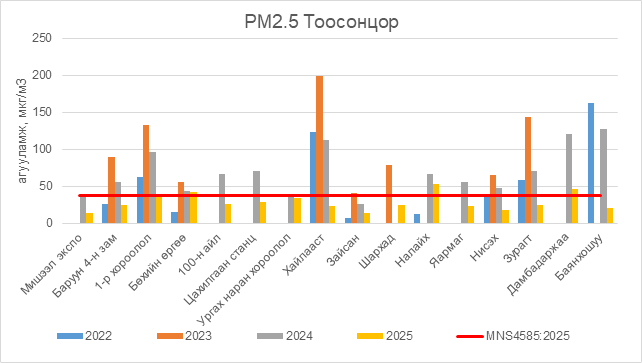РМ2.5 тоосонцор нь 1-р хороолол орчим АЧС-аас 0.5 мкг/м3 –ээр их, Бөхийн өргөө орчим АЧС-аас 4.5 мкг/м3 –ээр их, Налайх орчим АЧС-аас 15.5 мкг/м3 –ээр их, Дамбадаржаа орчим АЧС-аас 8.5 мкг/м3 –ээр их бусад цэгүүдэд MNS 4585:2025 АЧС-аас даваагүй байна.