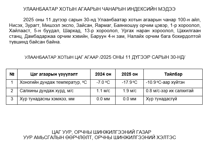 2025 оны 11 дүгээр сарын 30-ны байдлаар хүхэрлэг хий (SO2) нь бүх цэгүүдэд MNS 4585:2025 АЧС-аас даваагүй байна.