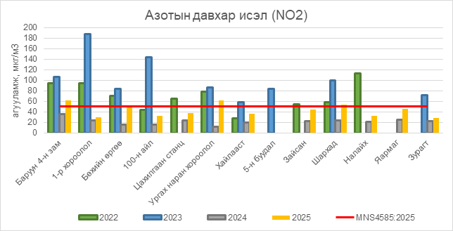 Азотын давхар исэл (NO2) нь Баруун 4-н зам орчим АЧС-аас 11 мкг/м3 –ээр их, Бөхийн өргөө орчим АЧС-аас 2 мкг/м3 –ээр их, Ургах наран хороолол орчим АЧС-аас 12 мкг/м3 –ээр их, Шархад орчим АЧС-аас 4 мкг/м3 –ээр их, бусад цэгүүдэд MNS 4585:2025 АЧС-аас даваагүй байна.