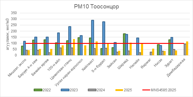 РМ10 тоосонцор нь Цахилгаан станц орчим АЧС-аас 35 мкг/м3 –ээр их, Хайлааст орчим АЧС-аас 16 мкг/м3 –ээр их, 5-н буудал орчим АЧС-аас 3 мкг/м3 –ээр их, Шархад орчим АЧС-аас 5 мкг/м3 –ээр их, Дамбадаржаа орчим АЧС-аас 15 мкг/м3 –ээр их, бусад цэгүүдэд MNS 4585:2025 АЧС-аас даваагүй байна.