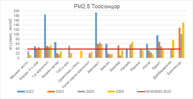 РМ2.5 тоосонцор нь Баруун 4-н зам орчим АЧС-аас 2.5 мкг/м3 –ээр их, 1-р хороолол орчим АЧС-аас 16.5 мкг/м3 –ээр их, Хайлааст орчим АЧС-аас 21.5 мкг/м3 –ээр их, Налайх орчим АЧС-аас 31.5 мкг/м3 –ээр их, Дамбадаржаа орчим АЧС-аас 40.5 мкг/м3 –ээр их, Баянхошуу орчим АЧС-аас 113.5 мкг/м3 –ээр их, бусад цэгүүдэд MNS 4585:2025 АЧС-аас даваагүй байна.