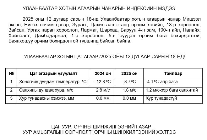 2025 оны 12 дугаар сарын 18-ны байдлаар хүхэрлэг хий (SO2) нь Баруун 4-н зам орчим АЧС-аас 10 мкг/м3 –ээр их, 1-р хороолол орчим 6 мкг/м3 –ээр их, Ургах наран хороолол орчим АЧС-аас 2 мкг/м3 –ээр их, 5-н буудал орчим АЧС-аас 3 мкг/м3 –ээр их, Зайсан орчим АЧС-аас 33 мкг/м3 –ээр их, Баянхошуу орчим АЧС-аас 75 мкг/м3 –ээр их, бусад цэгүүдэд MNS 4585:2025 АЧС-аас даваагүй байна.