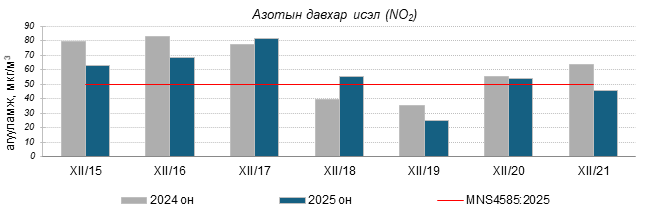 Улаанбаатар хотын агаарт түгээмэл бохирдуулах бодис хүхэрлэг хий /SO2/, азотын давхар исэл /NO2/, тоосонцор /PM10, PM2.5/, нүүрстөрөгчийн дутуу исэл /CO/, озон /O3/-ны агууламжийг тодорхойллоо.