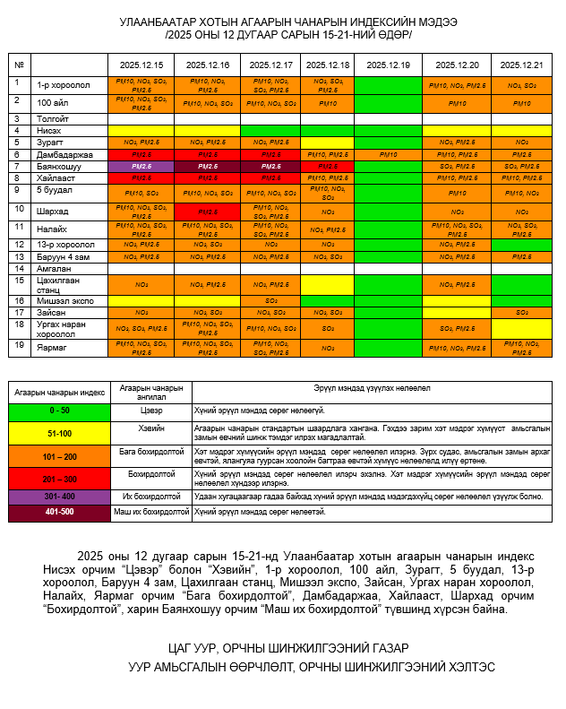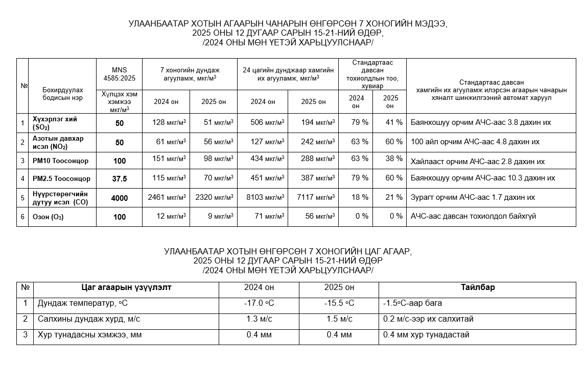 УЛААНБААТАР ХОТЫН АГААРЫН ЧАНАРЫН 7 ХОНОГИЙН МЭДЭЭ /2025.12.15-2025.12.21/