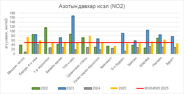 Азотын давхар исэл (NO2) нь Мишээл экспо орчим АЧС-аас 24 мкг/м3 –ээр их, Баруун 4-н зам орчим АЧС-аас 9 мкг/м3 –ээр их, Бөхийн өргөө орчим АЧС-аас 3 мкг/м3 –ээр их, Цахилгаан станц орчим АЧС-аас 30 мкг/м3 –ээр их, Шархад орчим АЧС-аас 4 мкг/м3 –ээр их, Налайх орчим АЧС-аас 13 мкг/м3 –ээр их, бусад цэгүүдэд MNS 4585:2025 АЧС-аас даваагүй байна.