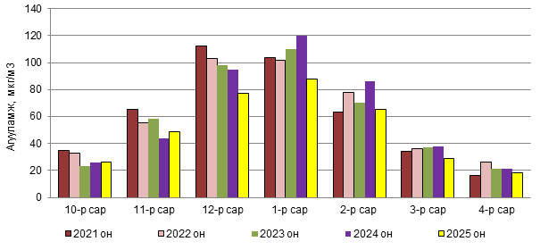Улаанбаатар хотын агаар бохирдуулах бодисын 2025 оны 12 дугаар сарын дундаж агууламжийг өмнөх оны мөн үе буюу 2024 оны 12 дугаар сарын дундаж агууламжтай харьцуулахад PM2.5 тоосонцор 18 мкг/м3-ээр буюу 19 %-иар, PM10 тоосонцор 25 мкг/м3-ээр буюу 19 %-иар, хүхэрлэг хий (SO2) нь 62 мкг/м3-ээр буюу 57 %-иар тус тус бага, харин азотын давхар исэл (NO2) нь 4 мкг/м3-ээр буюу 7 %-иар их байлаа.