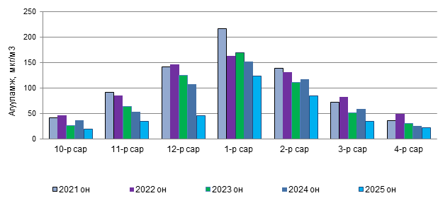 Зураг 5. PM10 тоосонцрын 12 дугаар сарын дундаж агууламж, 2021-2025 он