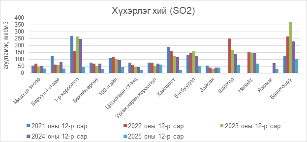 2025 оны 12 дугаар сарын хүхэрлэг хий (SO2)-н дундаж агууламжийг 2024 оны 12 дугаар сартай харьцуулахад Мишээл экспо 16 мкг/м3-ээр, Баруун 4 зам 46 мкг/м3-ээр, 1-р хороолол 203 мкг/м3-ээр, Бөхийн өргөө 36 мкг/м3-ээр, 100 айл 50 мкг/м3-ээр, Цахилгаан станц 21 мкг/м3-ээр, Ургах наран хороолол 10 мкг/м3-ээр, Хайлааст 91 мкг/м3-ээр, 5 буудал 74 мкг/м3-ээр, Шархад 82 мкг/м3-ээр, Налайх 78 мкг/м3-ээр, Яармаг 42 мкг/м3-ээр, Баянхошуу 122 мкг/м3-ээр тус тус бага, харин Зайсан 3 мкг/м3-ээр их байна (Зураг 12).