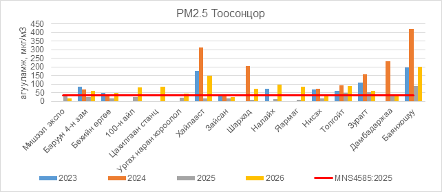 РМ2.5 тоосонцор нь Баруун 4-н зам орчим АЧС-аас 23.5 мкг/м3 –ээр их, Бөхийн өргөө орчим АЧС-аас 13.5 мкг/м3 –ээр их, 100-н айл орчим АЧС-аас 45.5 мкг/м3 –ээр их, Цахилгаан станц орчим АЧС-аас 49.5 мкг/м3 –ээр их, Ургах наран хороолол орчим АЧС-аас 7.5 мкг/м3 –ээр их, Хайлааст орчим АЧС-аас 112.5 мкг/м3 –ээр их, Шархад орчим АЧС-аас 35.5 мкг/м3 –ээр их, Налайх орчим АЧС-аас 60.5 мкг/м3 –ээр их, Яармаг орчим АЧС-аас 49.5 мкг/м3 –ээр их, Нисэх орчим АЧС-аас 0.5 мкг/м3 –ээр их, Толгойт орчим АЧС-аас 52.5 мкг/м3 –ээр их, Зурагт орчим АЧС-аас 23.5 мкг/м3 –ээр их, Дамбадаржаа орчим АЧС-аас 5.5 мкг/м3 –ээр их, Баянхошуу орчим АЧС-аас 165.5 мкг/м3 –ээр их байна.