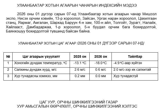 2026 оны 01 дүгээр сарын 07-ны байдлаар хүхэрлэг хий (SO2) нь Ургах наран хороолол орчим АЧС-аас 10 мкг/м3 –ээр их, Налайх орчим АЧС-аас 14 мкг/м3 –ээр их, Толгойт орчим АЧС-аас 44 мкг/м3 –ээр их, Баянхошуу орчим АЧС-аас 61 мкг/м3 –ээр их, бусад цэгүүдэд MNS 4585:2025 АЧС-аас даваагүй байна.