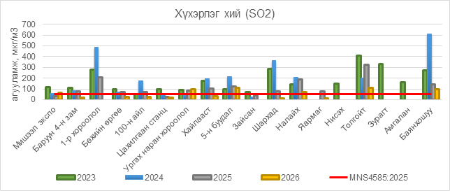 2026 оны 01 дүгээр сарын 27-ны байдлаар хүхэрлэг хий (SO2) нь Мишээл экспо орчим АЧС-аас 13 мкг/м3 –ээр их, Ургах наран хороолол орчим АЧС-аас 47 мкг/м3 –ээр их, 5-н буудал орчим АЧС-аас 63 мкг/м3 –ээр их, Налайх орчим АЧС-аас 20 мкг/м3 –ээр их, Толгойт орчим АЧС-аас 62 мкг/м3 –ээр их, Баянхошуу орчим АЧС-аас 48 мкг/м3 –ээр их, бусад цэгүүдэд MNS 4585:2025 АЧС-аас даваагүй байна.
