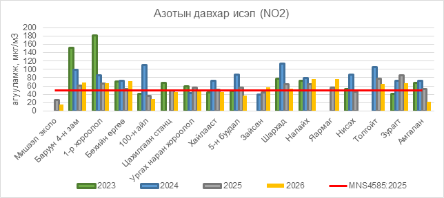 Азотын давхар исэл (NO2) нь Баруун 4-н зам орчим АЧС-аас 18 мкг/м3 –ээр их, 1-р хороолол орчим 17 мкг/м3 –ээр их, Бөхийн өргөө орчим АЧС-аас 22 мкг/м3 –ээр их, Ургах наран хороолол орчим АЧС-аас 1 мкг/м3 –ээр их, Зайсан орчим АЧС-аас 6 мкг/м3 –ээр их, Шархад орчим АЧС-аас 3 мкг/м3 –ээр их, Налайх орчим АЧС-аас 27 мкг/м3 –ээр их, Яармаг орчим АЧС-аас 27 мкг/м3 –ээр их, Толгойт орчим АЧС-аас 15 мкг/м3 –ээр их, Зурагт орчим АЧС-аас 17 мкг/м3 –ээр их, бусад цэгүүдэд MNS 4585:2025 АЧС-аас даваагүй байна.