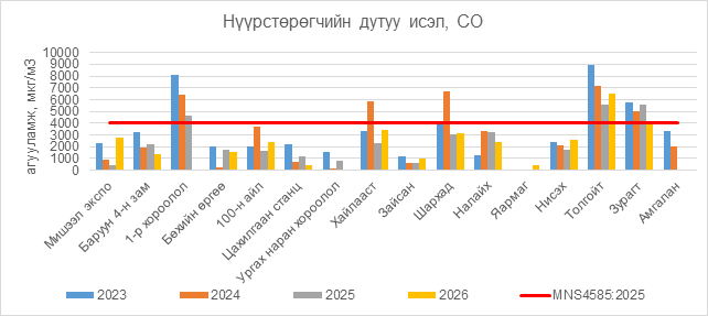 Нүүрстөрөгчийн дутуу исэл (СО) нь Толгойт орчим АЧС-аас 2564 мкг/м3 –ээр их, Зурагт орчим АЧС-аас 35 мкг/м3 –ээр их, бусад цэгүүдэд MNS 4585:2025 АЧС-аас даваагүй байна.