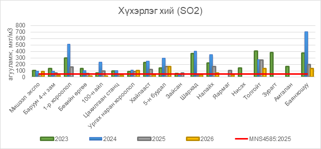 2026 оны 01 дүгээр сарын 28-ны байдлаар хүхэрлэг хий (SO2) нь Мишээл экспо орчим АЧС-аас 39 мкг/м3 –ээр их, Ургах наран хороолол орчим АЧС-аас 53 мкг/м3 –ээр их, 5-н буудал орчим АЧС-аас 113 мкг/м3 –ээр их, Налайх орчим АЧС-аас 13 мкг/м3 –ээр их, Толгойт орчим АЧС-аас 84 мкг/м3 –ээр их, Баянхошуу орчим АЧС-аас 83 мкг/м3 –ээр их, бусад цэгүүдэд MNS 4585:2025 АЧС-аас даваагүй байна.