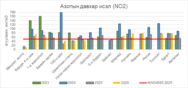 Азотын давхар исэл (NO2) нь Баруун 4-н зам орчим АЧС-аас 23 мкг/м3 –ээр их, 1-р хороолол орчим 13 мкг/м3 –ээр их, Шархад орчим АЧС-аас 16 мкг/м3 –ээр их, Налайх орчим АЧС-аас 28 мкг/м3 –ээр их, Яармаг орчим АЧС-аас 30 мкг/м3 –ээр их, Толгойт орчим АЧС-аас 27 мкг/м3 –ээр их, Зурагт орчим АЧС-аас 28 мкг/м3 –ээр их,  бусад цэгүүдэд MNS 4585:2025 АЧС-аас даваагүй байна.