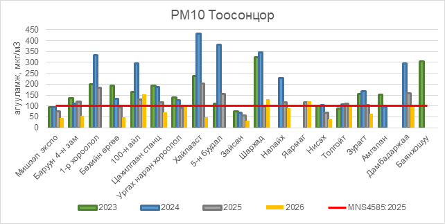 РМ10 тоосонцор нь 100-н айл орчим АЧС-аас 53 мкг/м3 –ээр их, Ургах наран хороолол орчим АЧС-аас 3 мкг/м3 –ээр их, Шархад орчим АЧС-аас 31 мкг/м3 –ээр их, Яармаг орчим АЧС-аас 22 мкг/м3 –ээр их, Дамбадаржаа орчим АЧС-аас 3 мкг/м3 –ээр их, бусад цэгүүдэд MNS 4585:2025 АЧС-аас даваагүй байна.