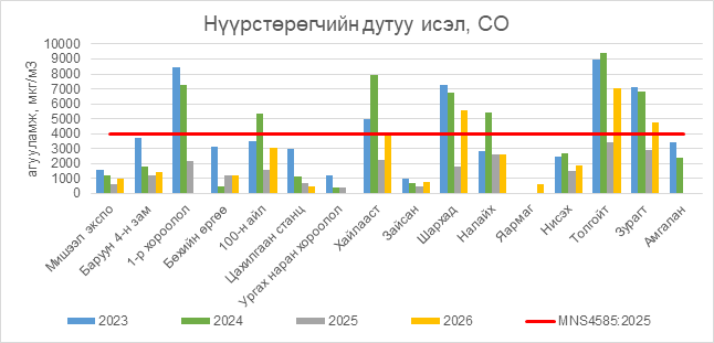 Нүүрстөрөгчийн дутуу исэл (СО) нь Хайлааст орчим АЧС-аас 92 мкг/м3 –ээр их, Шархад орчим АЧС-аас 1581 мкг/м3 –ээр их, Толгойт орчим АЧС-аас 3030 мкг/м3 –ээр их, Зурагт орчим АЧС-аас 766 мкг/м3 –ээр их, бусад цэгүүдэд MNS 4585:2025 АЧС-аас даваагүй байна.