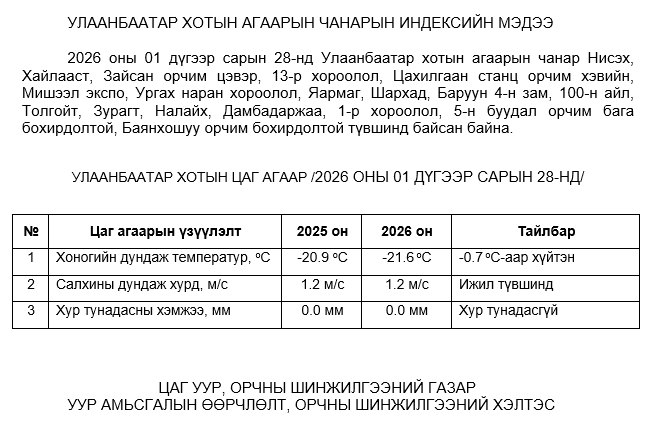 УЛААНБААТАР ХОТЫН АГААРЫН ЧАНАРЫН ХЯНАЛТ ШИНЖИЛГЭЭНИЙ ХОНОГИЙН МЭДЭЭ /2026.01.28/