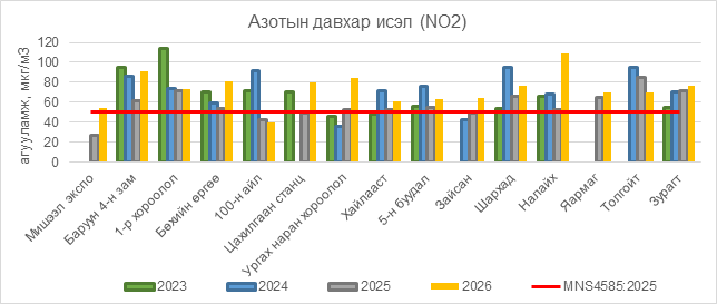 Азотын давхар исэл (NO2) нь Мишээл экспо орчим АЧС-аас 4 мкг/м3 –ээр их, Баруун 4-н зам орчим АЧС-аас 41 мкг/м3 –ээр их, 1-р хороолол орчим 23 мкг/м3 –ээр их, Бөхийн өргөө орчим АЧС-аас 31 мкг/м3 –ээр их, Цахилгаан станц орчим АЧС-аас 30 мкг/м3 –ээр их, Ургах наран хороолол орчим АЧС-аас 34 мкг/м3 –ээр их, Хайлааст орчим АЧС-аас 11 мкг/м3 –ээр их, 5-н буудал орчим АЧС-аас 13 мкг/м3 –ээр их, Зайсан орчим АЧС-аас 14 мкг/м3 –ээр их, Шархад орчим АЧС-аас 27 мкг/м3 –ээр их, Налайх орчим АЧС-аас 59 мкг/м3 –ээр их, Яармаг орчим АЧС-аас 20 мкг/м3 –ээр их, Толгойт орчим АЧС-аас 20 мкг/м3 –ээр их, Зурагт орчим АЧС-аас 27 мкг/м3 –ээр их байна.