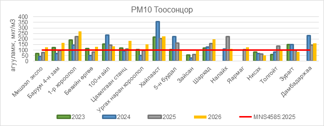 РМ10 тоосонцор нь Мишээл экспо орчим АЧС-аас 24 мкг/м3 –ээр их, Баруун 4-н зам орчим АЧС-аас 65 мкг/м3 –ээр их, 1-р хороолол орчим АЧС-аас 167 мкг/м3 –ээр их, Бөхийн өргөө орчим АЧС-аас 32 мкг/м3 –ээр их, 100-н айл орчим АЧС-аас 35 мкг/м3 –ээр их, Цахилгаан станц орчим АЧС-аас 82 мкг/м3 –ээр их, Ургах наран хороолол орчим АЧС-аас 51 мкг/м3 –ээр их, Хайлааст орчим АЧС-аас 126 мкг/м3 –ээр их, 5-н буудал орчим АЧС-аас 7 мкг/м3 –ээр их, Шархад орчим АЧС-аас 98 мкг/м3 –ээр их, Налайх орчим АЧС-аас 12 мкг/м3 –ээр их, Яармаг орчим АЧС-аас 25 мкг/м3 –ээр их, Дамбадаржаа орчим АЧС-аас 60 мкг/м3 –ээр их байна.