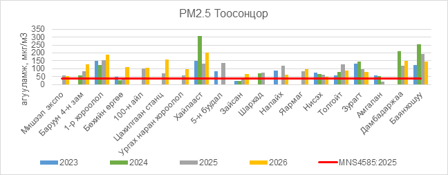 РМ2.5 тоосонцор нь Мишээл экспо орчим АЧС-аас 14.5 мкг/м3 –ээр их, Баруун 4-н зам орчим АЧС-аас 91.5 мкг/м3 –ээр их, 1-р хороолол орчим АЧС-аас 152.5 мкг/м3 –ээр их, Бөхийн өргөө орчим АЧС-аас 72.5 мкг/м3 –ээр их, 100-н айл орчим АЧС-аас 67.5 мкг/м3 –ээр их, Цахилгаан станц орчим АЧС-аас 119.5 мкг/м3 –ээр их, Ургах наран хороолол орчим АЧС-аас 61.5 мкг/м3 –ээр их, Хайлааст орчим АЧС-аас 165.5 мкг/м3 –ээр их, Зайсан орчим АЧС-аас 27.5 мкг/м3 –ээр их, Налайх орчим АЧС-аас 24.5 мкг/м3 –ээр их, Яармаг орчим АЧС-аас 61.5 мкг/м3 –ээр их, Нисэх орчим АЧС-аас 10.5 мкг/м3 –ээр их, Толгойт орчим АЧС-аас 48.5 мкг/м3 –ээр их, Зурагт орчим АЧС-аас 43.5 мкг/м3 –ээр их, Дамбадаржаа орчим АЧС-аас 110.5 мкг/м3 –ээр их, Баянхошуу орчим АЧС-аас 108.5 мкг/м3 –ээр их байна.