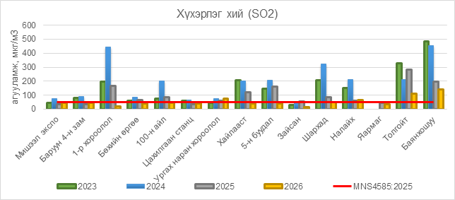 2026 оны 02 дугаар сарын 02-ны байдлаар хүхэрлэг хий (SO2) нь Ургах наран хороолол орчим АЧС-аас 26 мкг/м3 –ээр их, Налайх орчим АЧС-аас 15 мкг/м3 –ээр их, Толгойт орчим АЧС-аас 59 мкг/м3 –ээр их, Баянхошуу орчим АЧС-аас 93 мкг/м3 –ээр их, бусад цэгүүдэд MNS 4585:2025 АЧС-аас даваагүй байна.